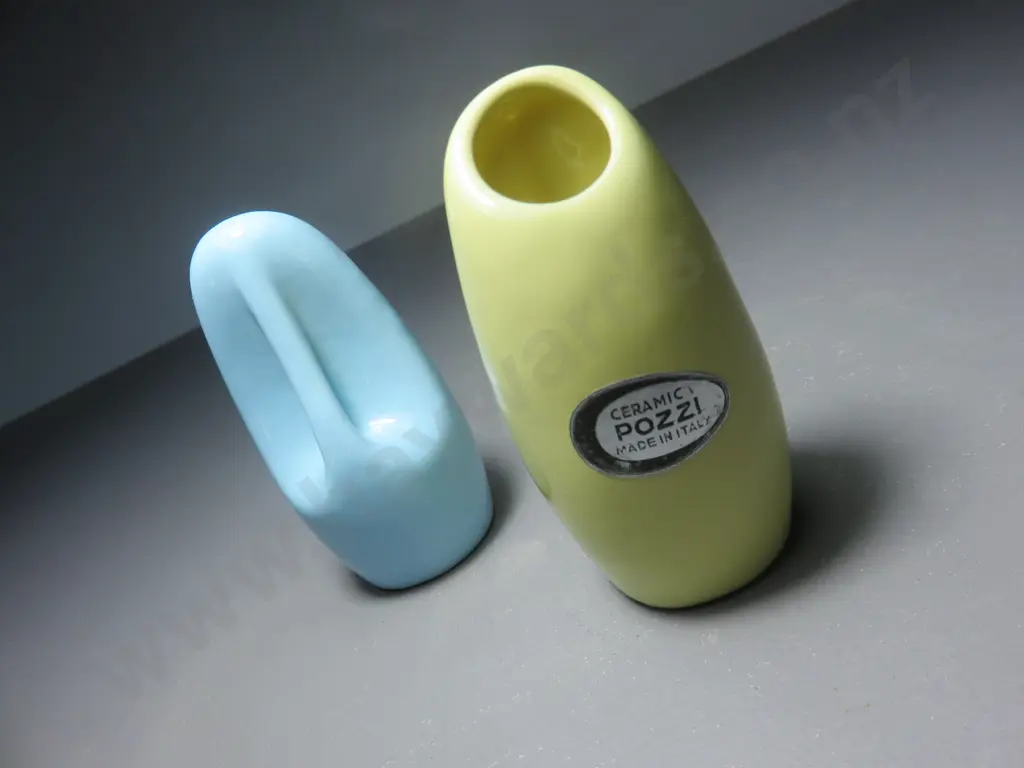 Pair of small vintage Franco Pozzi Pottery Vases. One in yellow, one in blue. Both retain their period Foil studio labels. Attributed to Ambrogio Pozzi. Measuring 80mm tall apiece. Circa 1960’s.