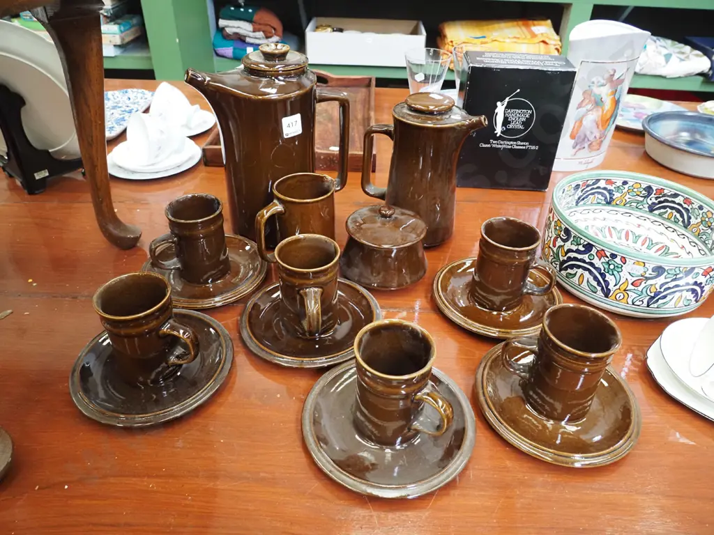 Temuka pottery stoneware coffee set, 2 jugs, creamer, 6 cups and saucers