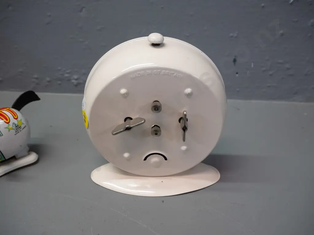 retro Smiths children's Noddy character alarm clock and a small wind up Mikuni Japanese tin toy with plastic legs. Clock