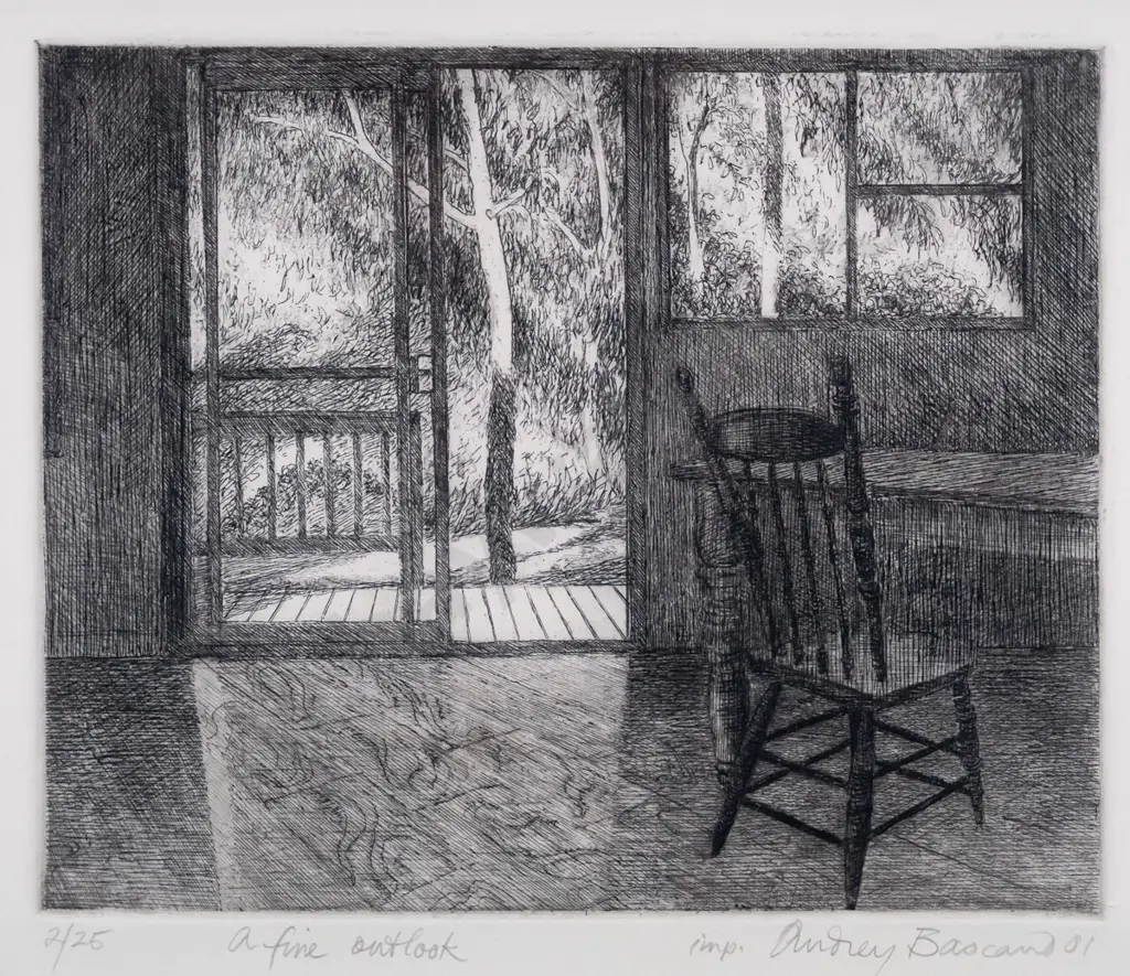 Audrey Bascand '01 - framed etching 2/25 "a find outlook" H-200 W-240