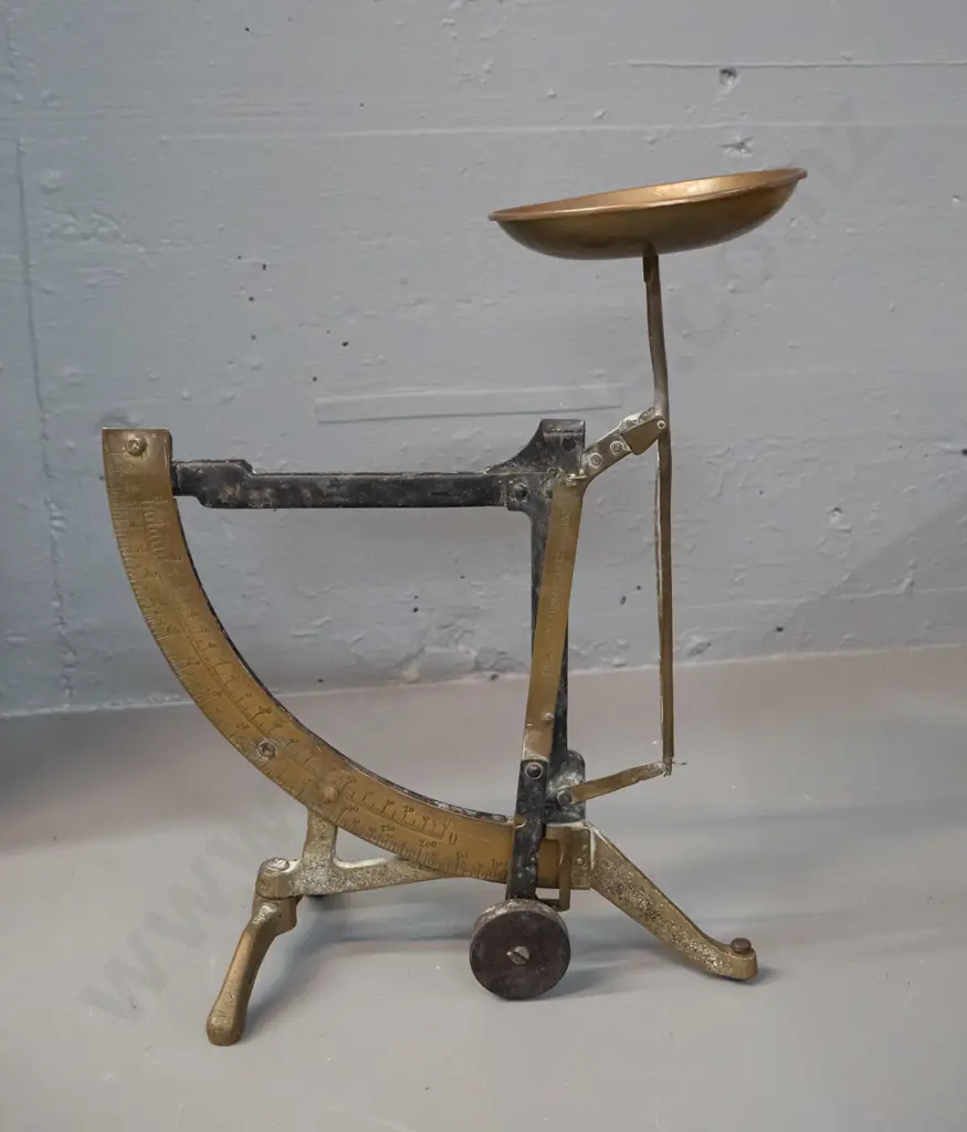 vintage brass folding swing-arm balance scales marked "dilarang untuk berdagang" which is Malay according to Google.
