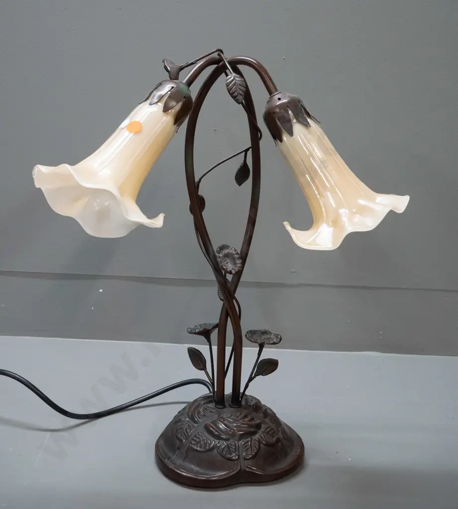 reproduction Tiffany style table lamp with 2 trumpet flower shaped glass shades and cast metal base H-440 W-340