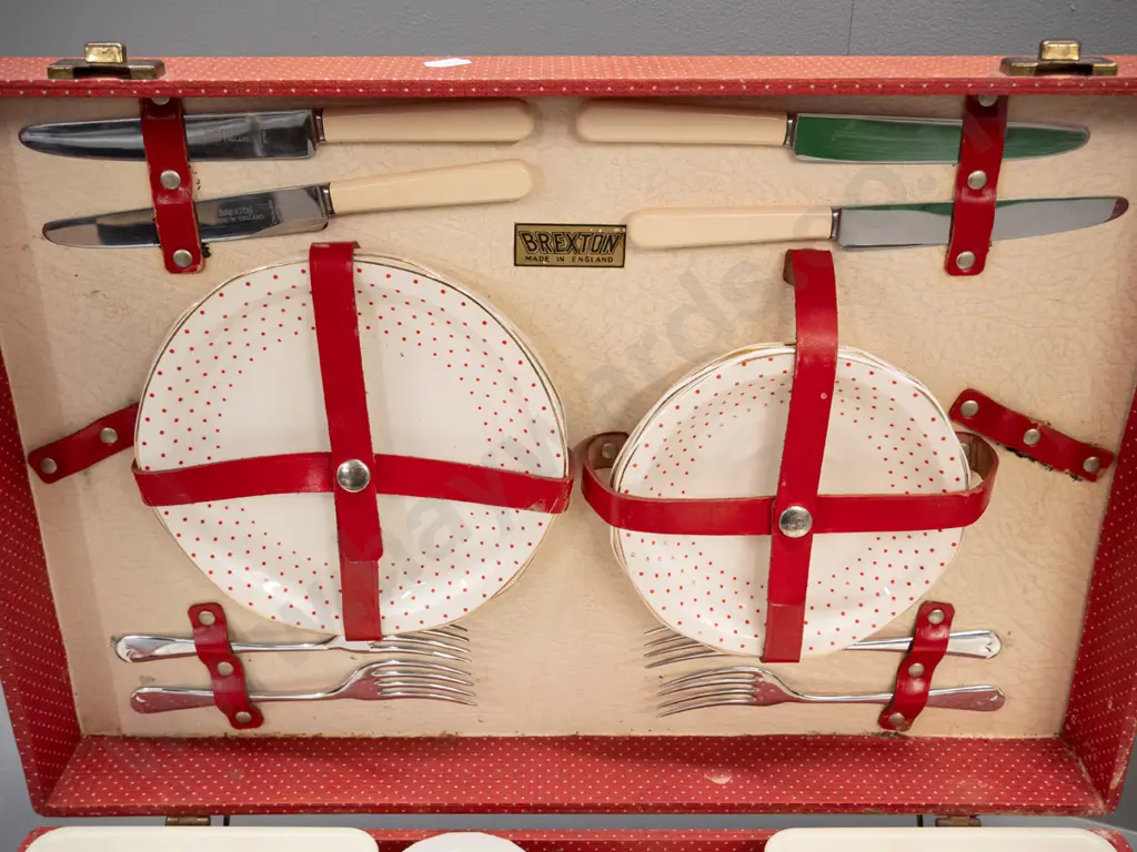 vintage English "Brexton" picnic set in hard case with Brexton branded china plates, cups and saucers, jars, food boxes,