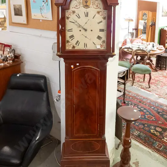 vintage mahogany Regency style long case clock with swan-neck pediment, flame mahogany panels with boxwood stringing,