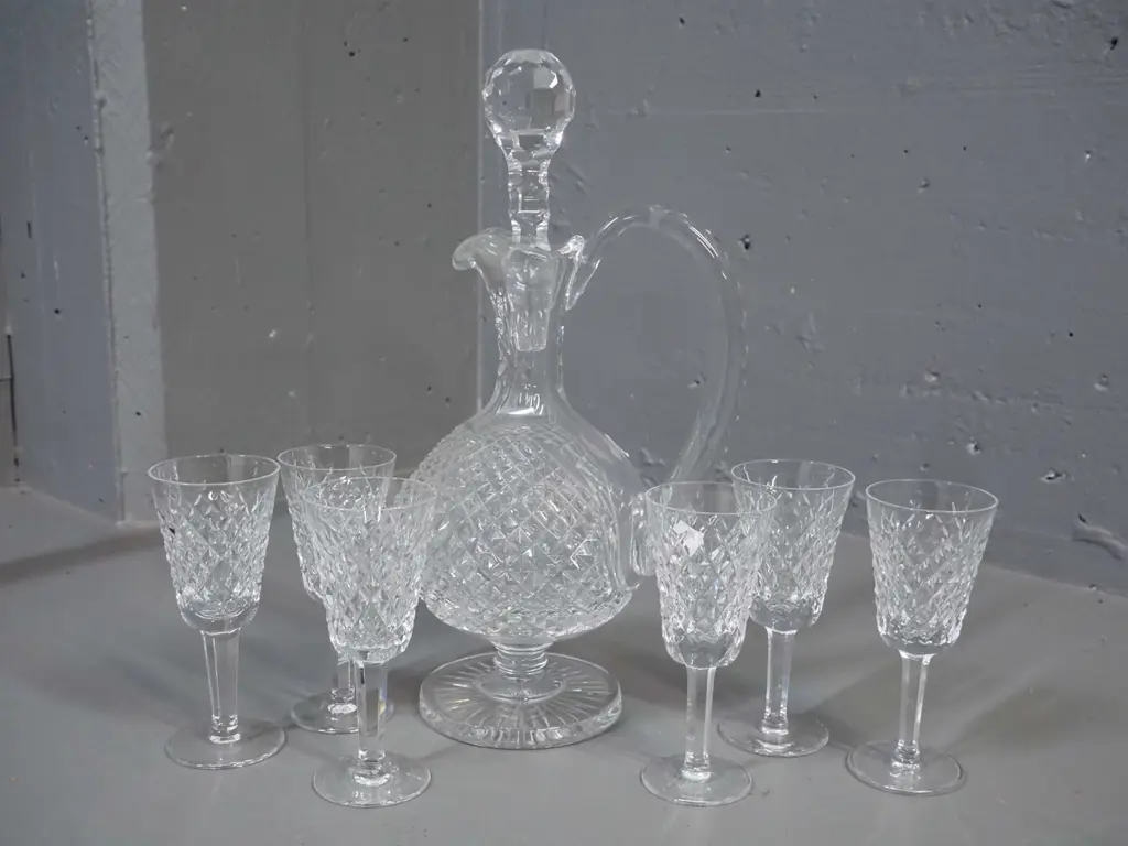 Waterford cut crystal stoppered & handled sherry decanter and 6 glasses - decanter H-325 W-170