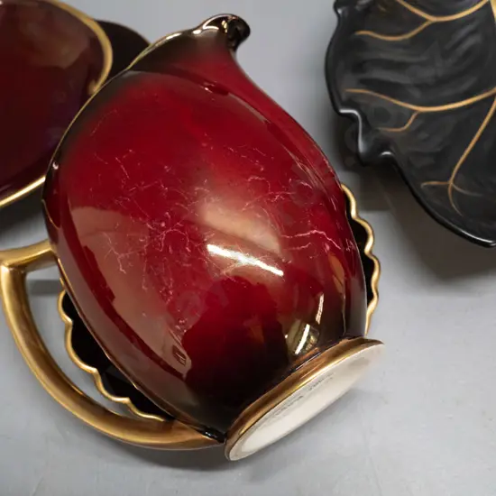 Carlton Ware Rouge Royal jug & dish, black gilt leaf dish, and a Crown Devon dish - jug H-150, has glaze scratch marks