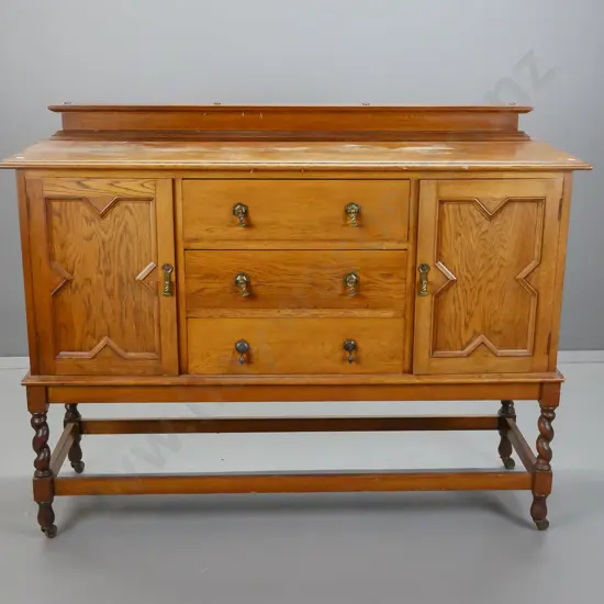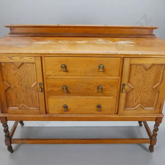 vintage oak Tudor style sideboard with 2 panelled doors, 3 drawers, brass drop handles, stretcher base with twist legs