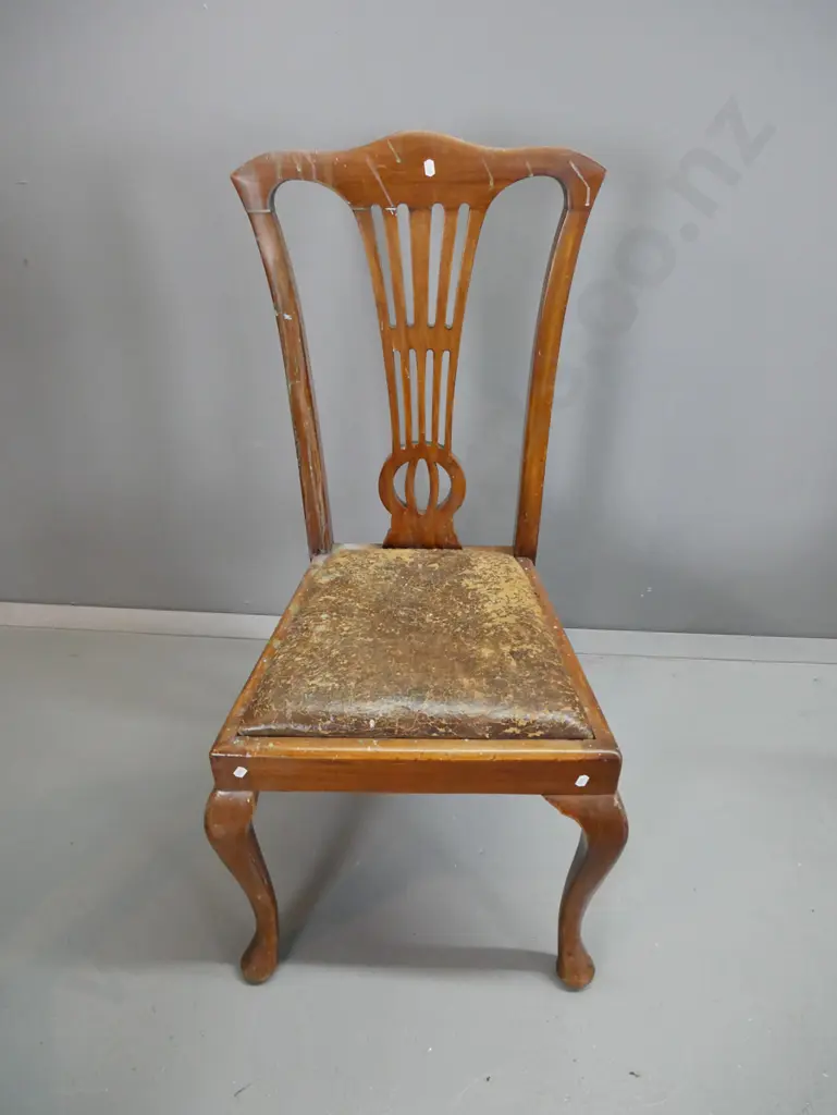 splats, one is a carver, leather upholstered seats. 2 chairs have loose joints, wear to leather, several with paint splashes. Table is faded, scratched. H-760 W-1230 L-1580 without leaves, Leaves are 425.