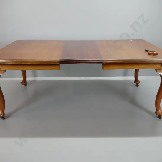 Edwardian walnut wind-out dining table with 2 leaves, large cab legs on casters, 7 Heppelwhite style chairs with pierced