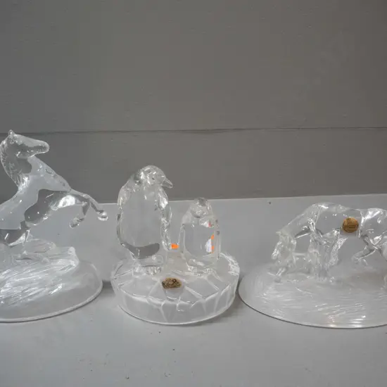 3 crystal figurines, 2 with labels - RCR penguin, Crystal D'Arques horse, and rearing horse H-160 with not label