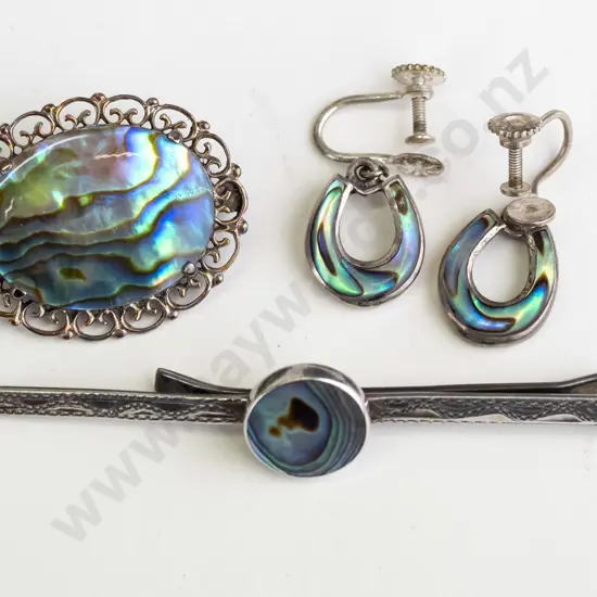 paua shell earrings [screw on], tie pin - stamped silver & paua shell brooch no mark