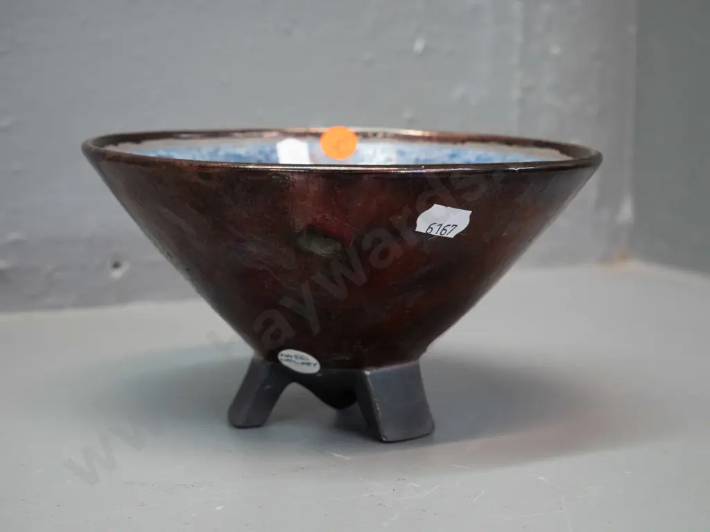 Neil Hey New Zealand pottery footed bowl with copper lustre exterior, tab feet, mottled blue interior H-100 D-170